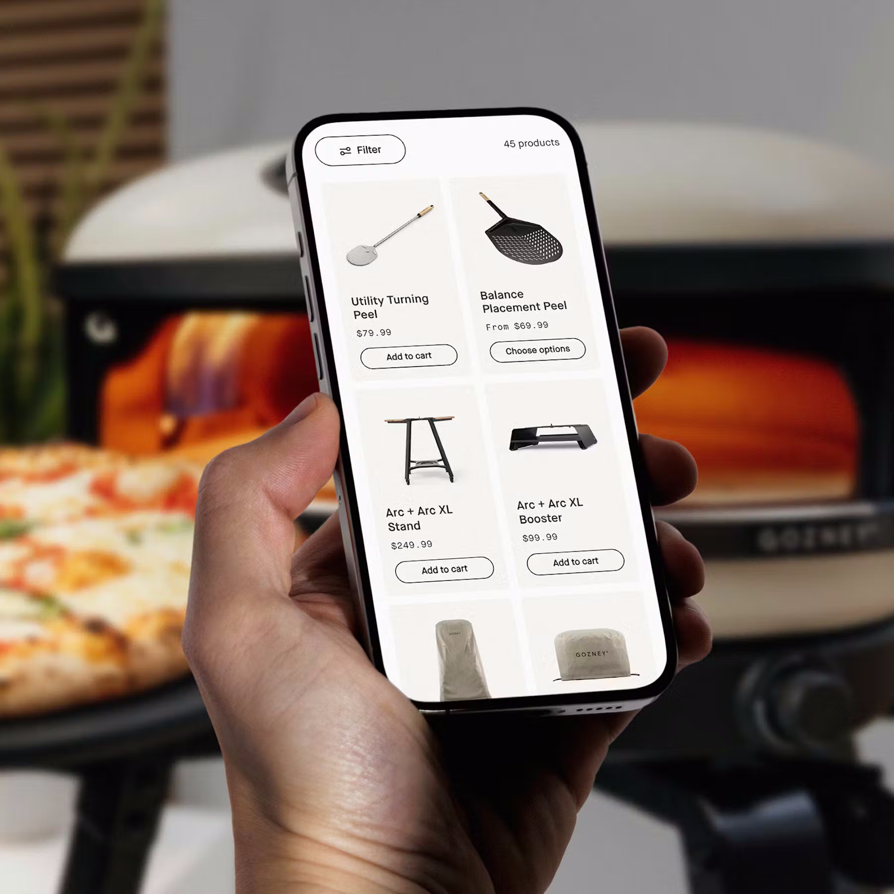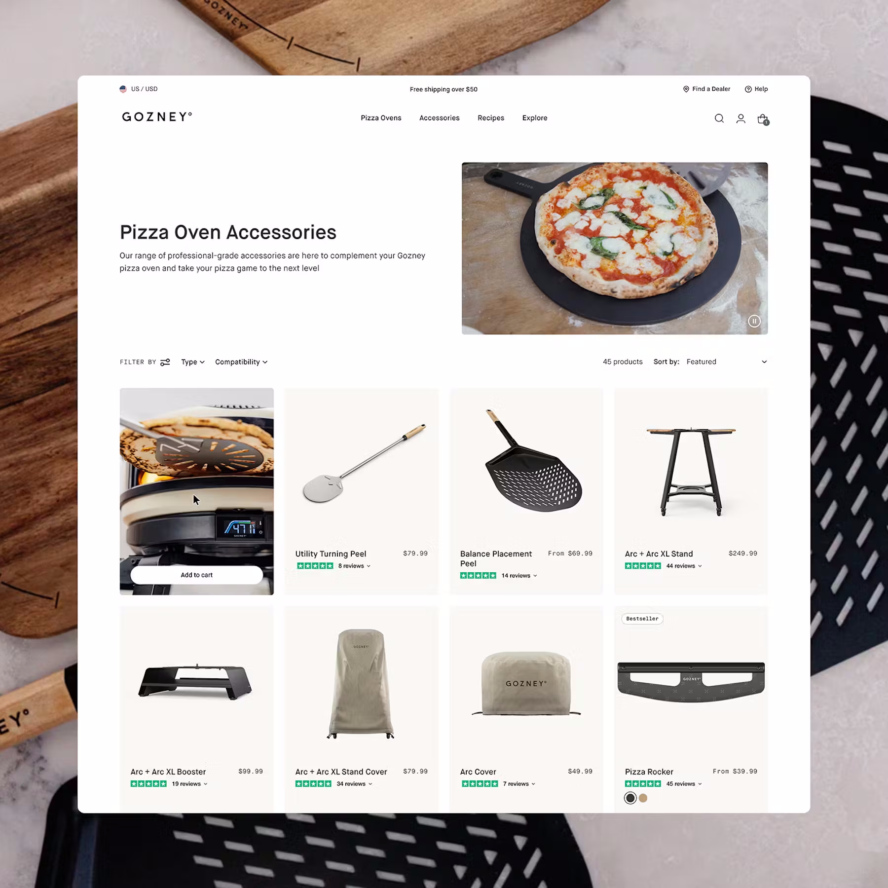 To elevate Gozney’s collection pages, autoplay video was integrated directly into the shopping journey, showcasing products in real-world use. This dynamic approach was complemented by lifestyle imagery incorporated into product cards to help novice pizza chefs quickly understand how accessories fit into the pizza-making process. Custom filters were implemented to allow customers to easily shop for accessories specific to their Gozney oven, making the buying journey more intuitive. Additionally, the revamped collections pages were designed with future growth in mind, ensuring they can support merchandising for future limited-edition product launches and brand collaborations.