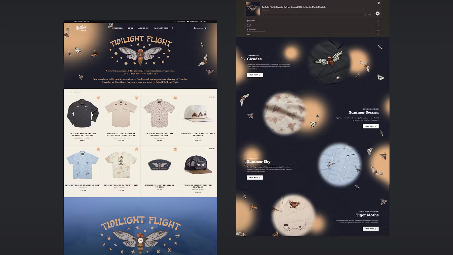 The project started by working closely with Howler Brothers to fully understand their brand persona and lifestyle. Shopify Plus was a great platform solution that was chosen based on their requirements. The goal was to create a new design system that leveraged reusable components to feature artwork and imagery in a way that fostered an emotional connection with their customers. These unique components made it easier to shop Howler’s frequently expanding product line through an elevated interactive experience. Another priority of the new site was to incorporate video vignettes and animation throughout the shopping journey.