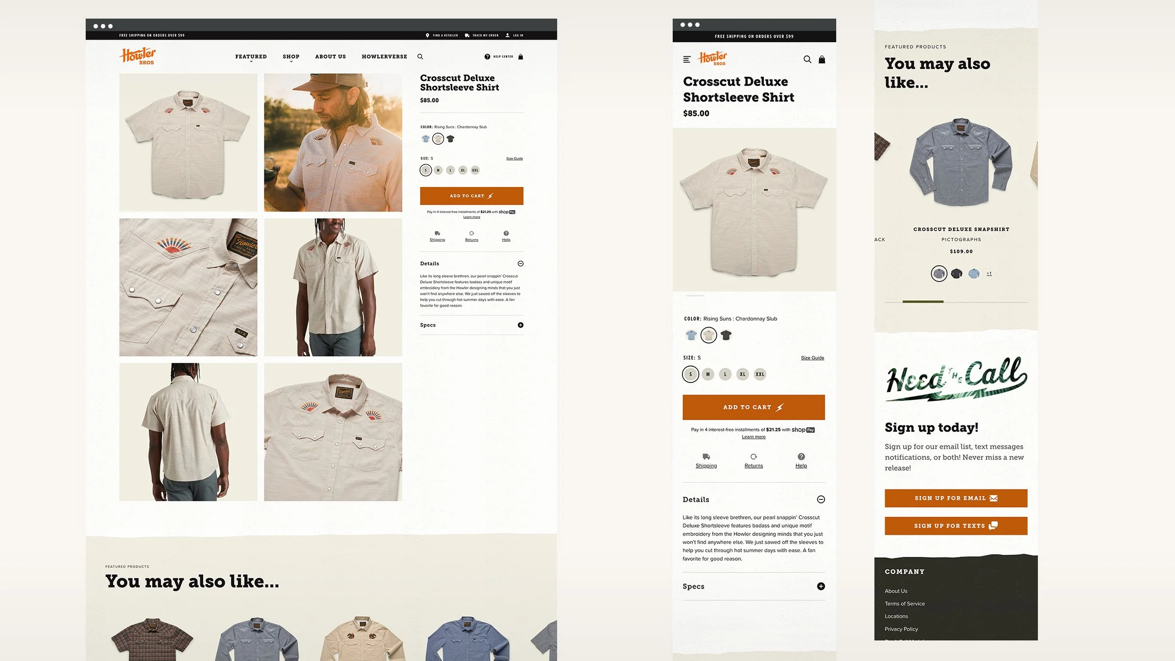 A large grid of product imagery with a full-screen zoom feature allowed for complete immersion into Howler Brothers’ unique product offering. I utilized flexible components with lifestyle imagery and video to tell the story of each product. Incorporating CTAs to explore full collections and adding a cross-sell feature reinforced a “no dead ends” policy on the product detail pages.