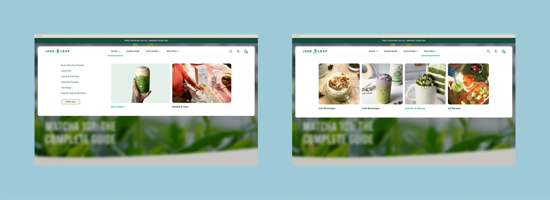 I created a new design system built on Shopify 2.0 and leveraged reusable components that reflected the feeling of community, energy, and healthy living that the Jade Leaf brand is known for. Through the discovery process, I identified key objectives to carry forward throughout the new site - let the brand shine, create pathways to product education and subscriptions, and maintain a quick and effortless shopping journey.