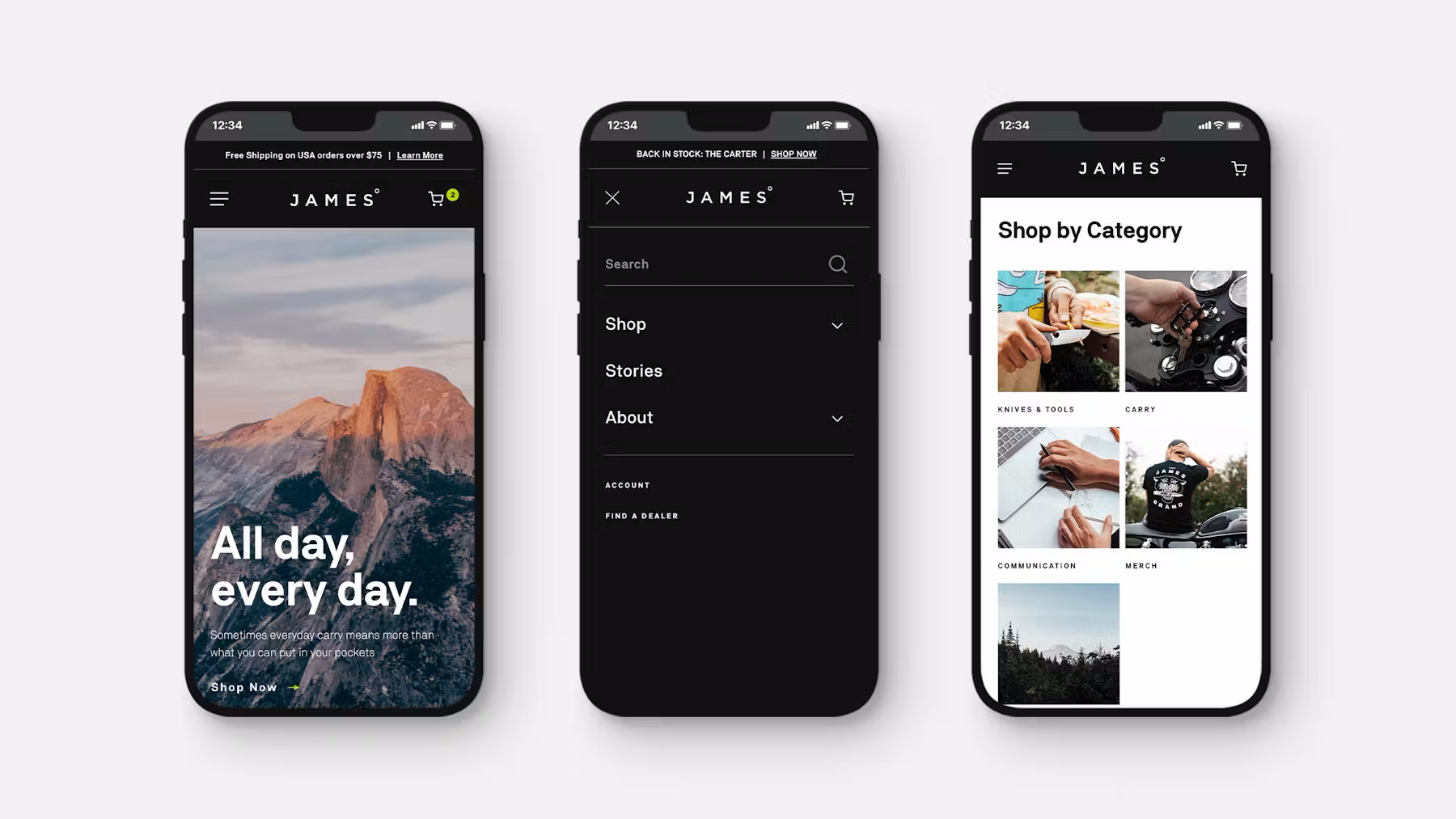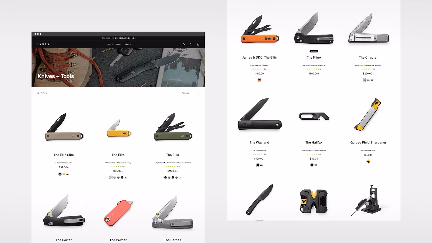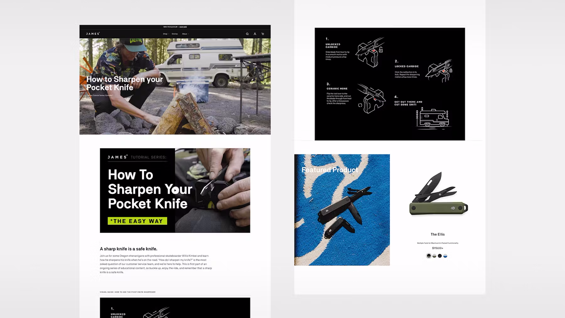 The James Brand supports a lifestyle where an everyday carry tool is essential. Their products are made for people who live for adventure and every knife or tool has a unique purpose and story behind it. When designing the category and product pages, the goal was to create an immersive shopping experience that connected their customers to the lifestyle, values and adventurous spirit of the brand.