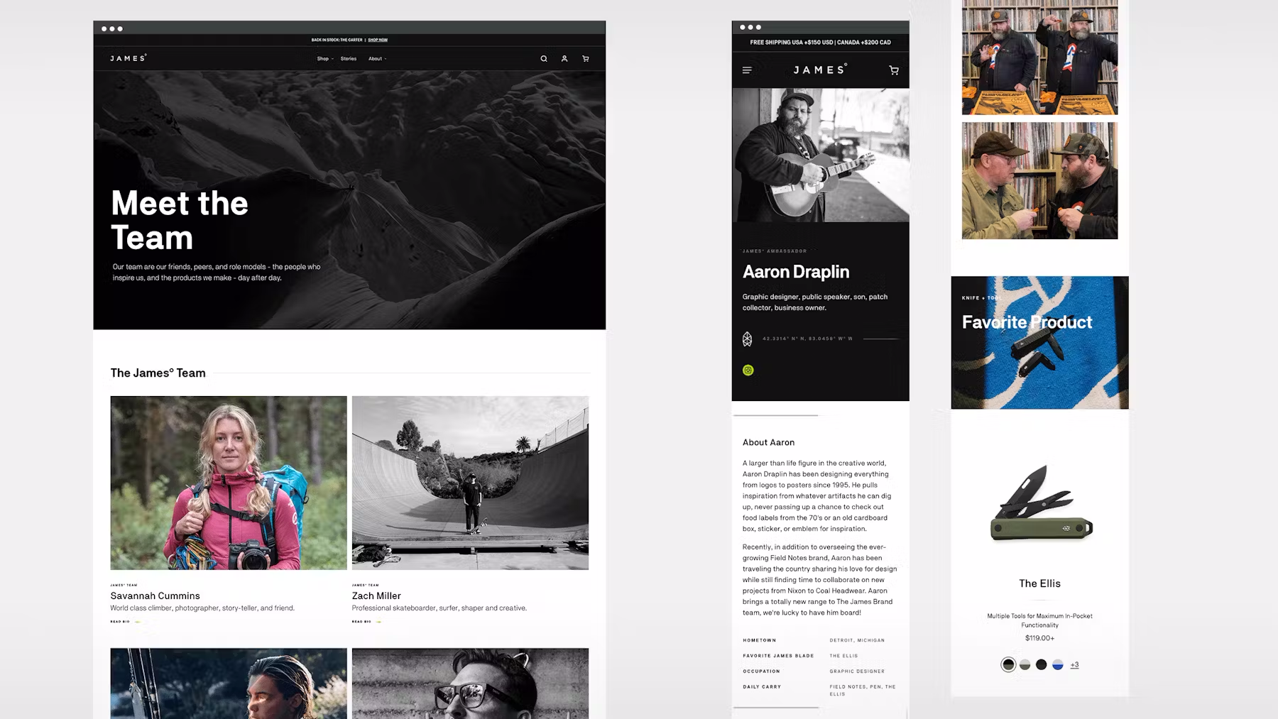 The James Brand has a large team of partners and ambassadors, each with their own varying backgrounds and personal stories. With this list of collaborators constantly growing, they needed a design with a flexible layout that was not only captivating, but one that would also allow for expansion into categories. The result was a lifestyle driven experience that allows each collaborator to share their unique story and a link to their favorite product.