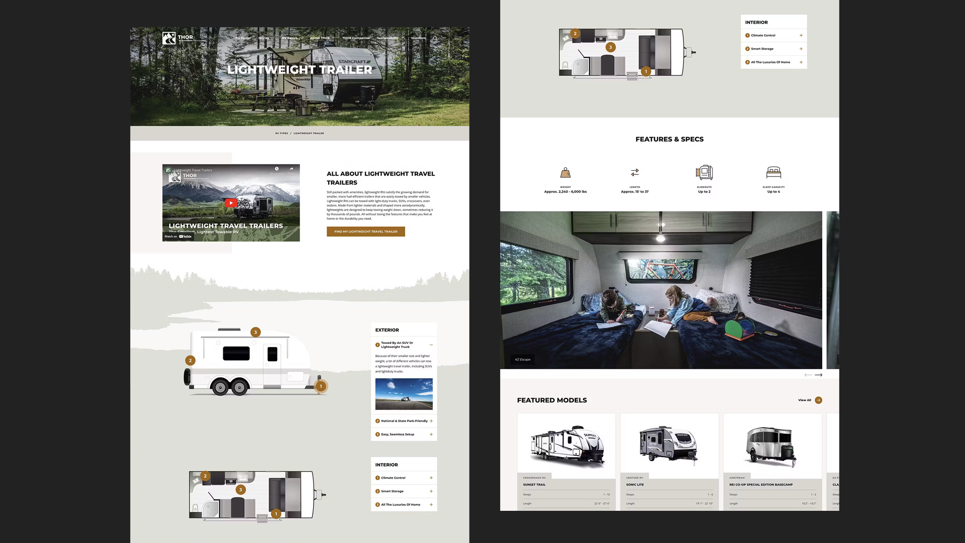 After the initial full site re-design I worked on with THOR Industries, their team identified that the ‘RV Types’ section on the site plays a critical role in the early stages of RV research and selection for consumers. THOR wanted to reimagine the way these pages look and function, to better educate consumers about the differences between RV Types, allowing them to narrow in on the perfect RV for their lifestyle. This process began with a clear brief from the THOR team and alignment on the specific objectives for these pages.